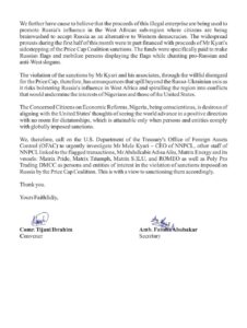 “The Concerned Citizens on Economic Reforms, Nigeria, being conscientious, is desirous of aligning with the United States’ thoughts of seeing the world advance in a positive direction with no room for dictatorships, which is attainable only when persons and entities comply with globally imposed sanctions.
