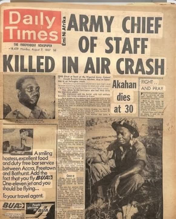 On Monday, August 7, 1967, the front page of the Daily Times newspaper delivered devastating news to a nation already engulfed in conflict. The headline reported the sudden death of Colonel Joseph Ronald Ityowua Akahan, the Chief of Army Staff of the Nigerian Army, who had died in a helicopter crash a day earlier, on August 6, 1967.