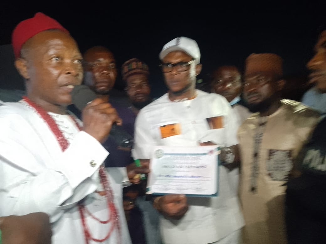 The APGA AMAC Chairmanship candidate, Hon Onyebuchi Chukwu, being honoured with the award of Igbogadi the 1st of Ndi Imo in Idu, at the New Yam Festival (Iwaj) organized by Imo Indigenes in Idu, the host community of Idu Industrial Area of the Federal Capital Territory.